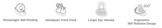 咬咬樂咀嚼訓練器(風琴式)適用於6個月或以上寶寶進食固體食物。其矽膠網袋容量特大,可以360度靈活轉動,配合寶寶較大的活動能力及進食需求。
